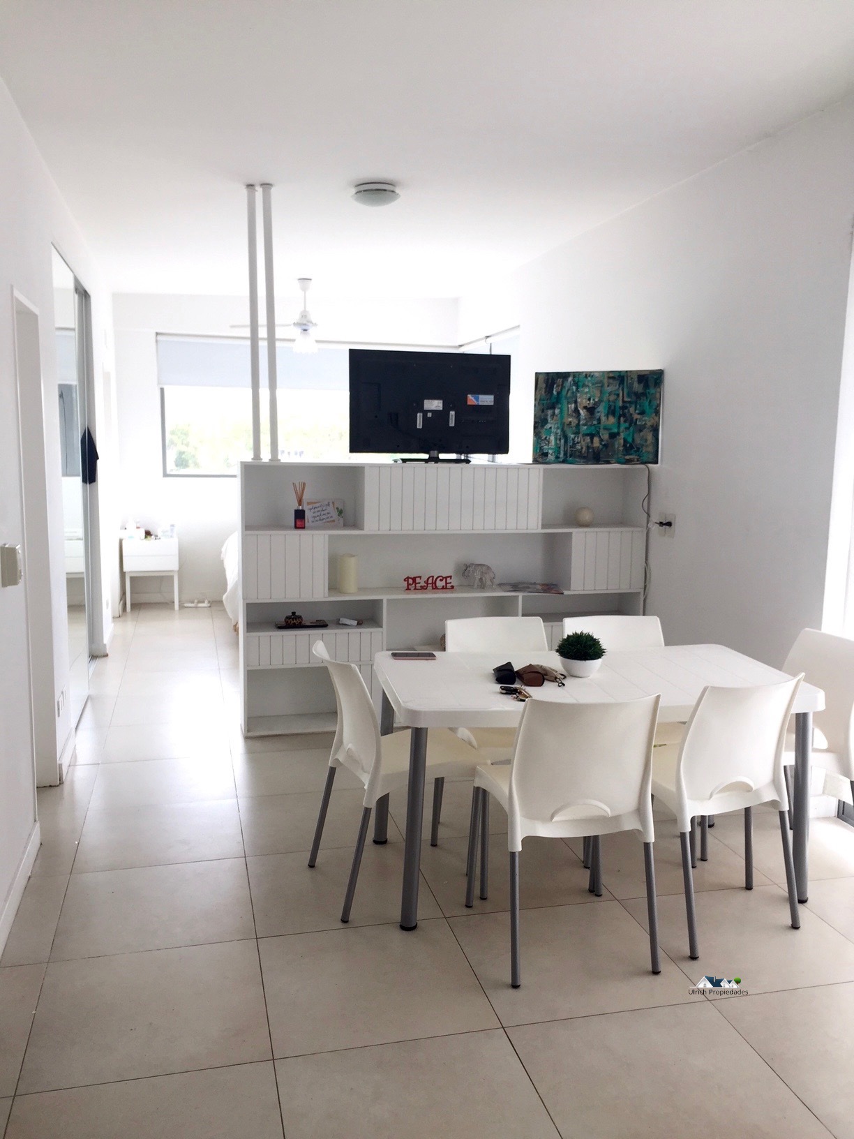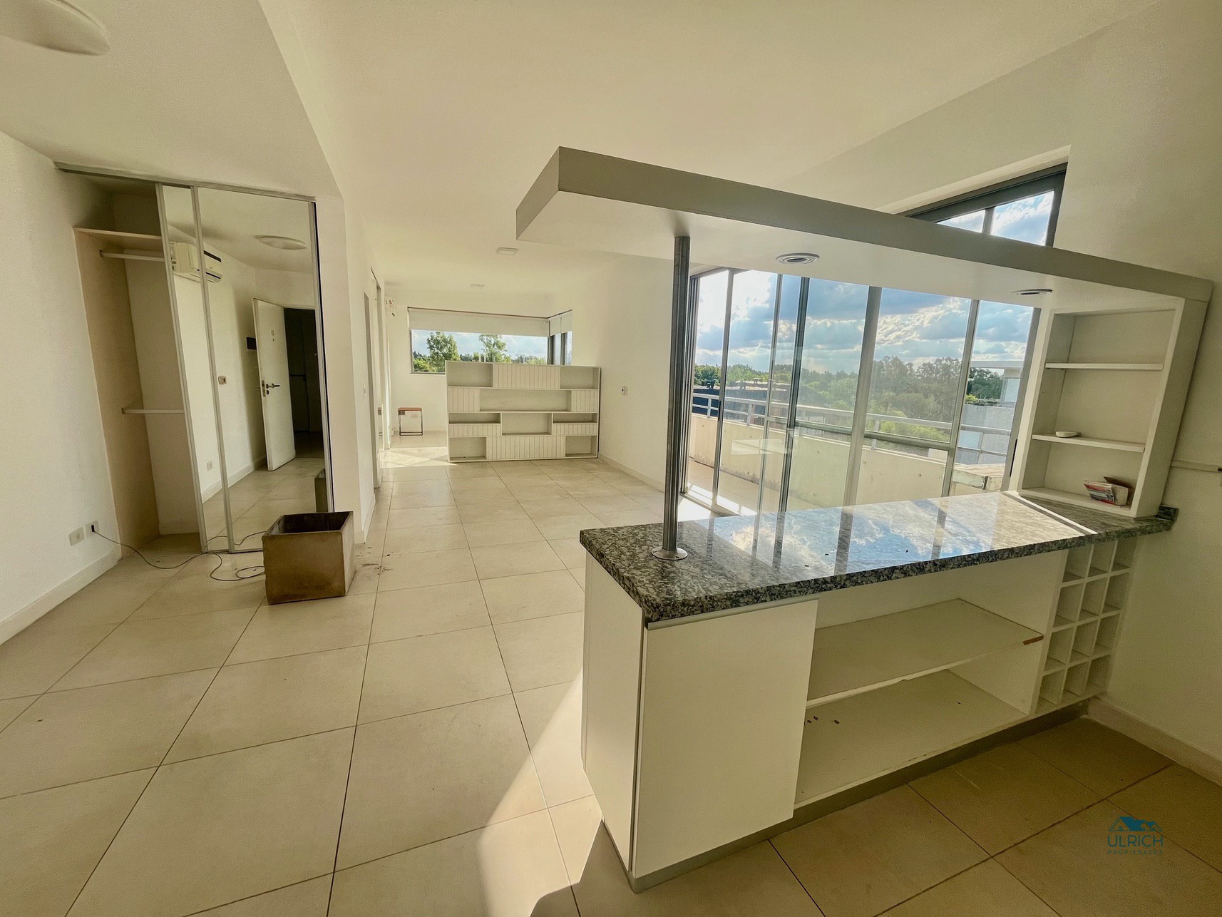 Monoambiente con división. Living/comedor con cocina integrada con barra. Toilette. Dormitorio con baño principal y placard. Balcón techado todo alrededor del departamento. Parrilla. Cochera cubierta subterránea.