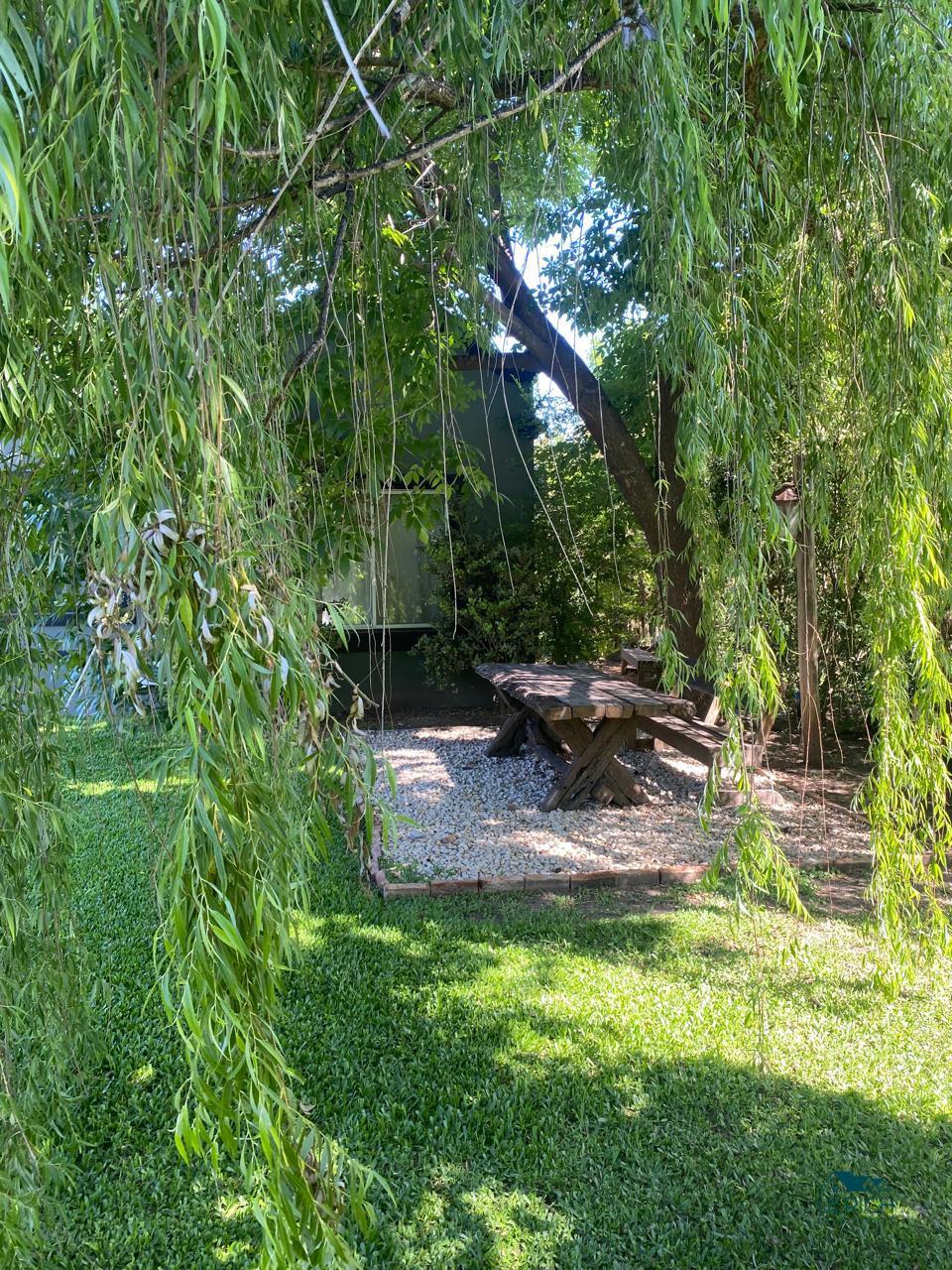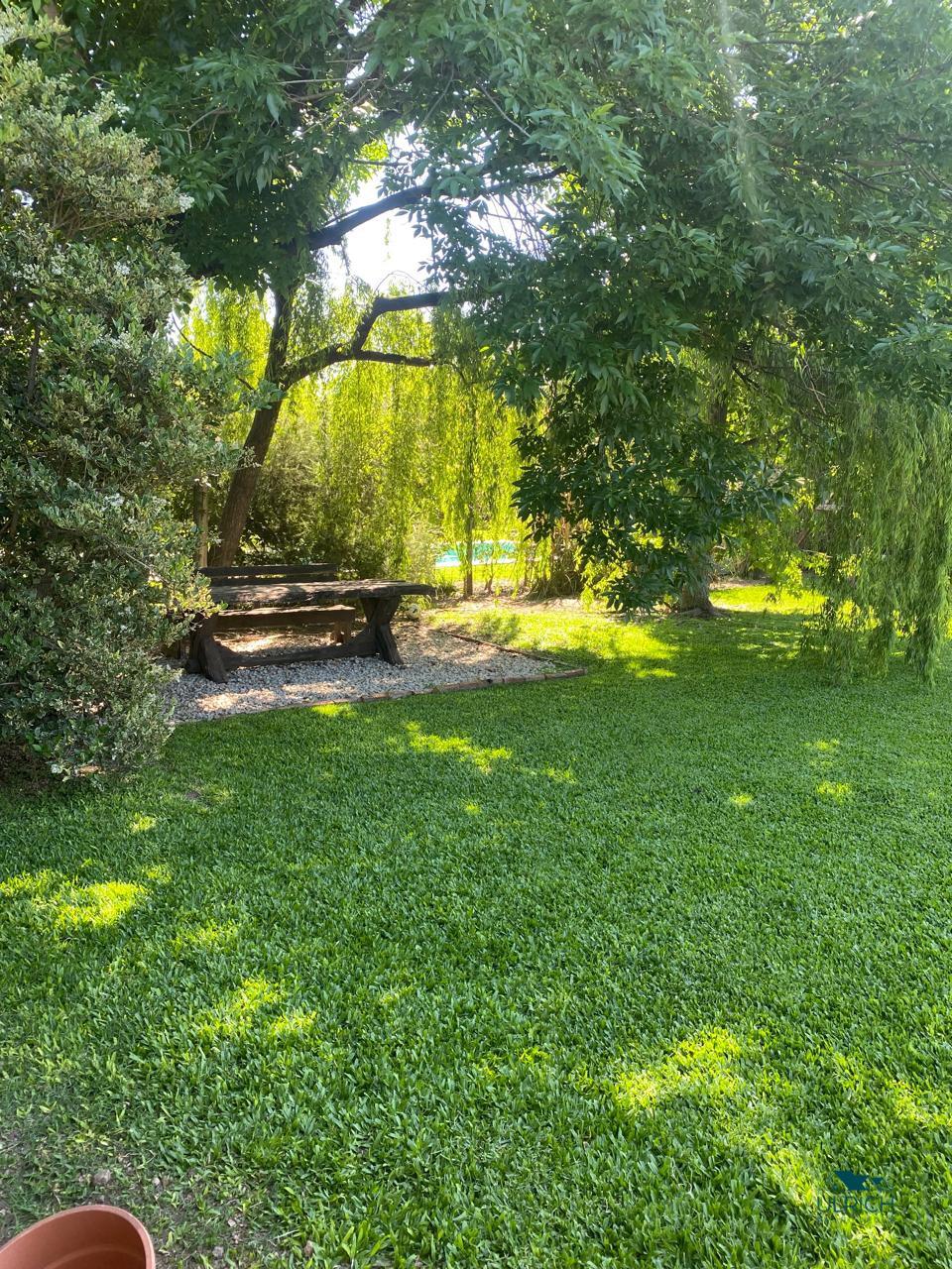 Exterior: El jardín es amplio, arbolado y muy bien mantenido. Dispone de una galería con parrilla, piscina de 32 m² revestida en venecitas con sistema de filtrado, y cochera descubierta para dos autos.