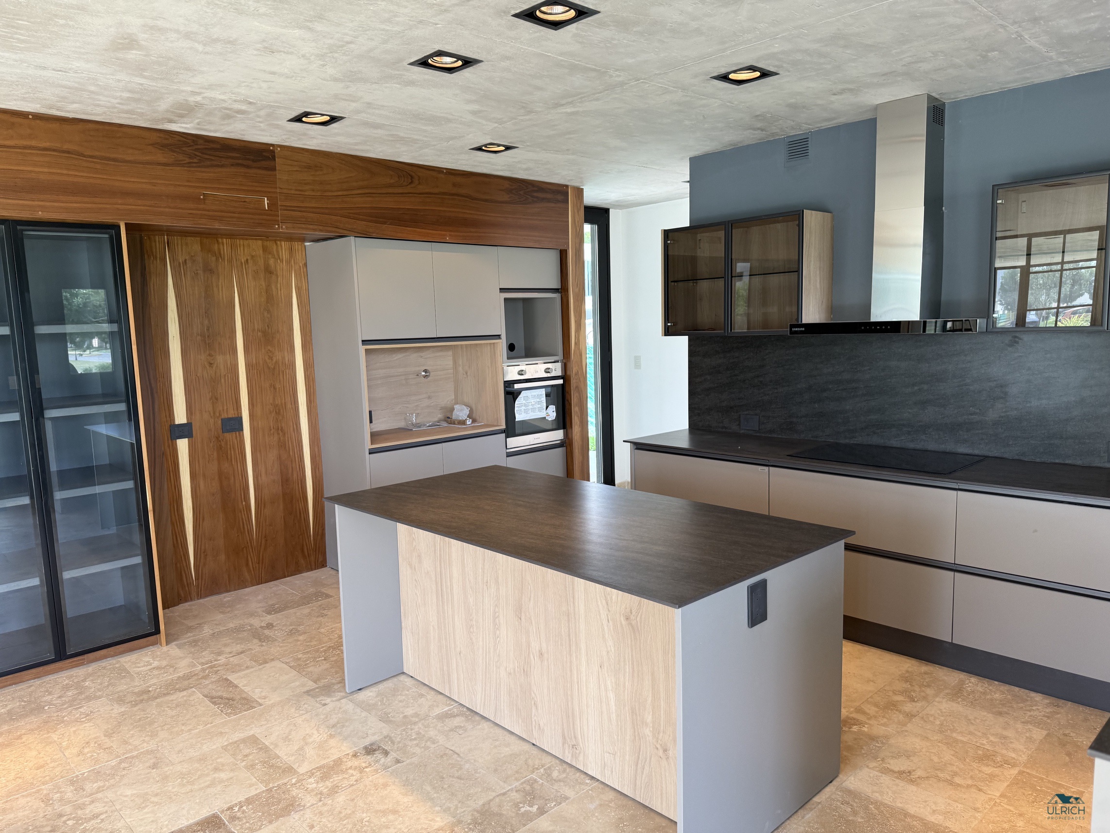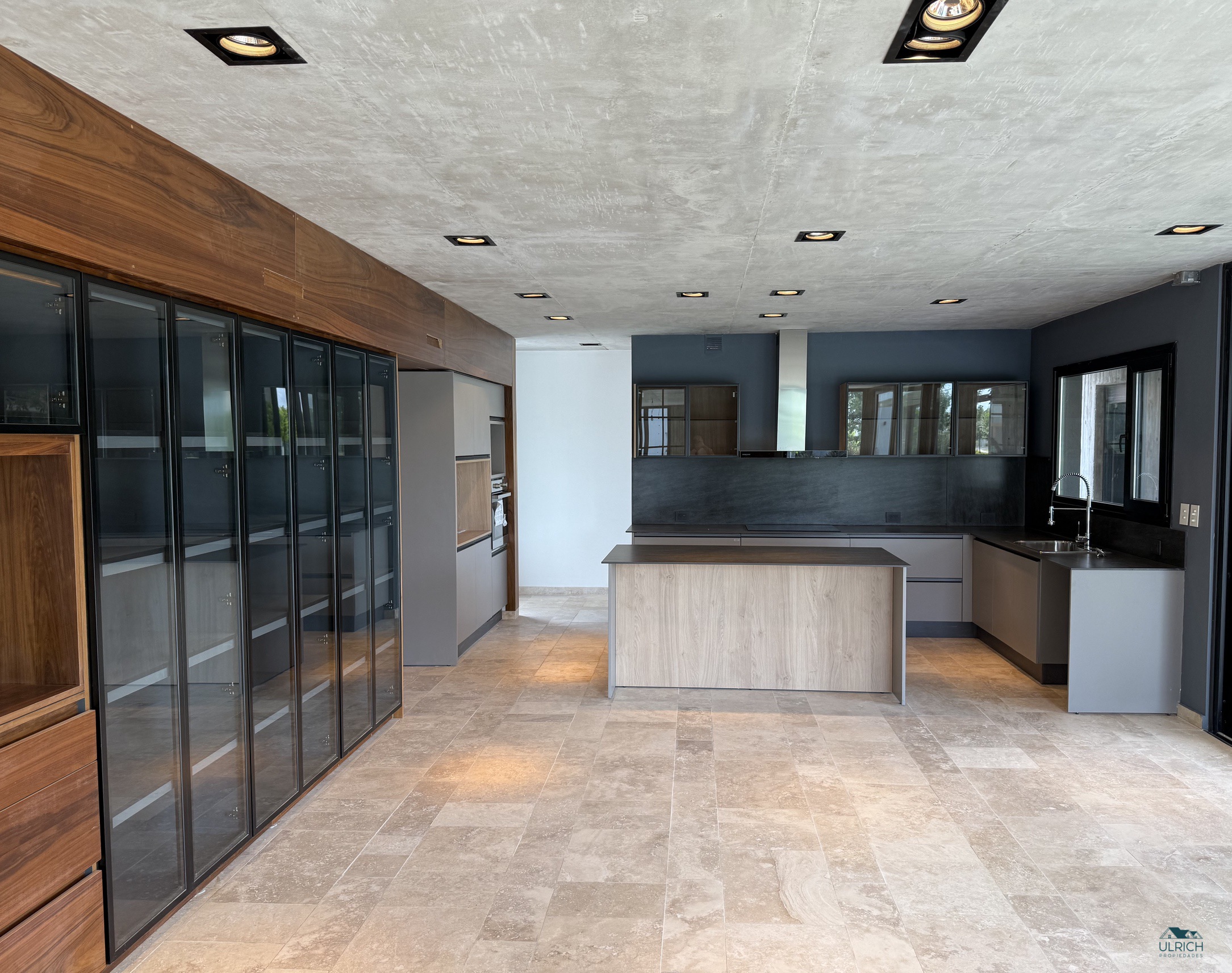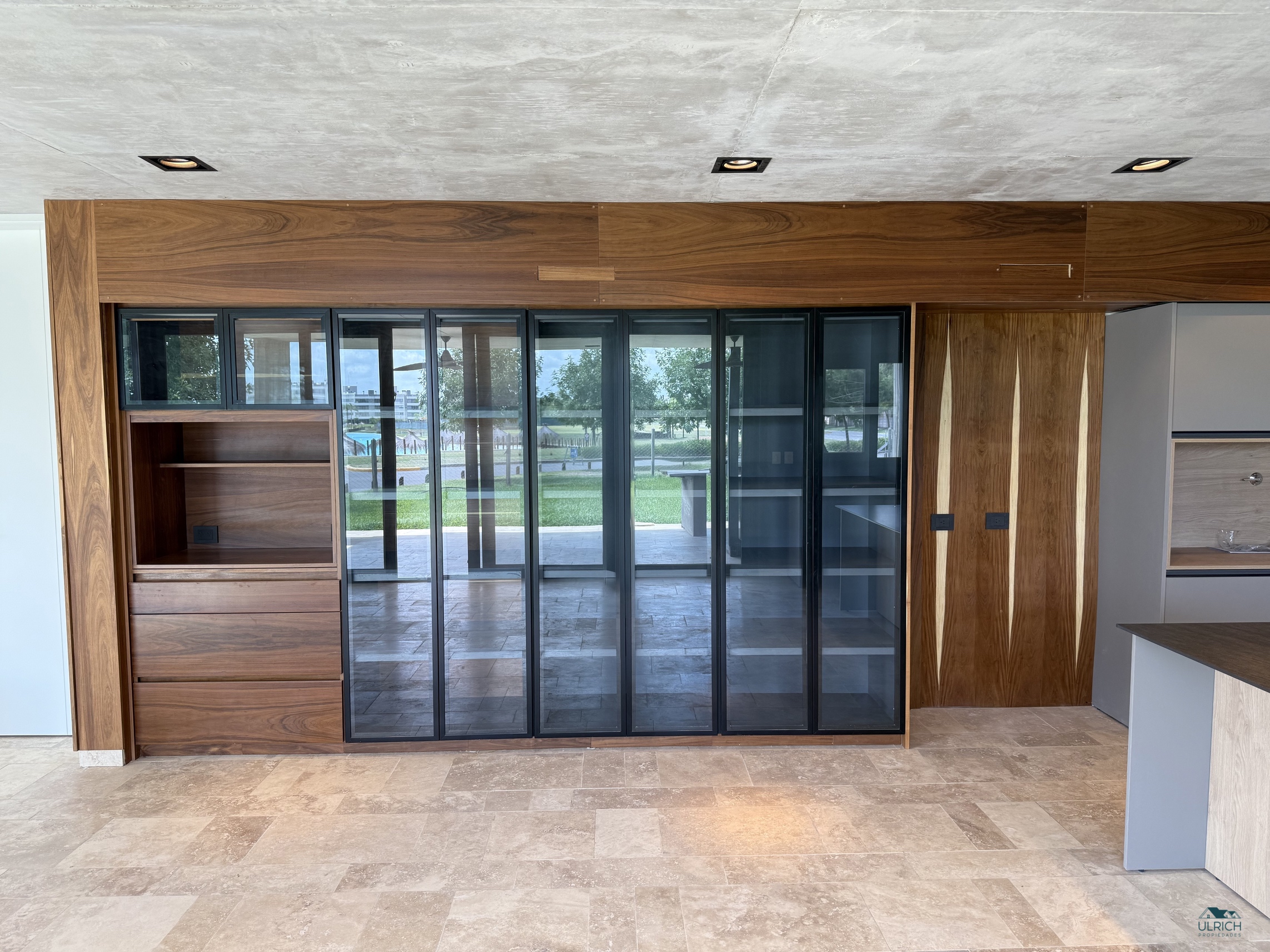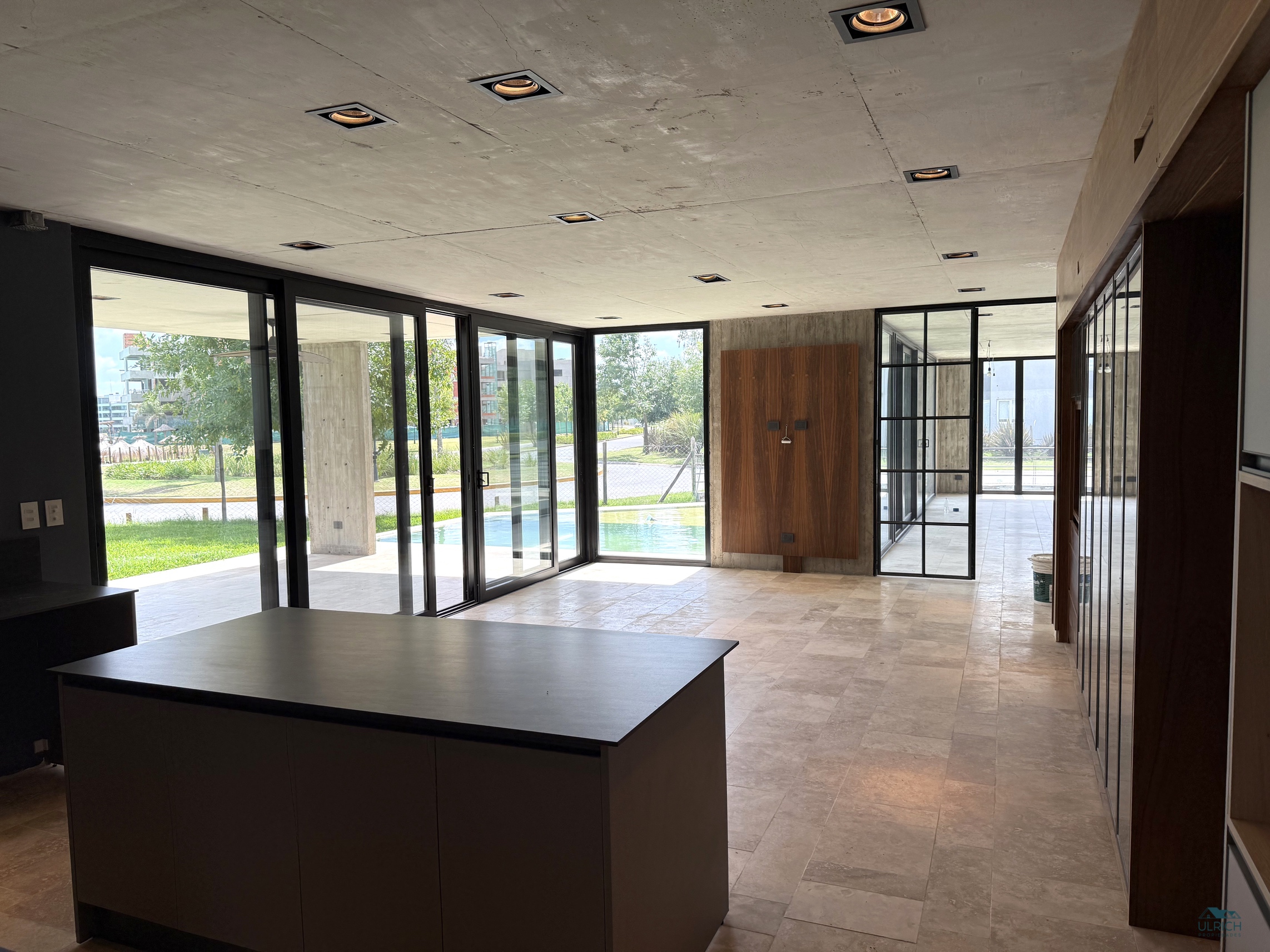 🏡 Planta Baja: Un elegante hall de entrada conduce a un amplio living comedor con visuales abiertas hacia la pileta y la laguna, generando una conexión directa con el exterior. Dispone de placard de recepción, escritorio o cuarto dormitorio con baño completo, y una cocina con comedor diario e isla central, equipada con anafe, horno eléctrico y vajillero en madera y vidrio. Incluye dependencia de servicio completa.