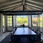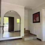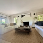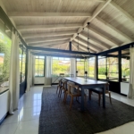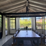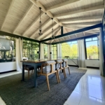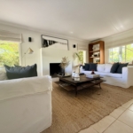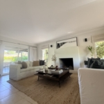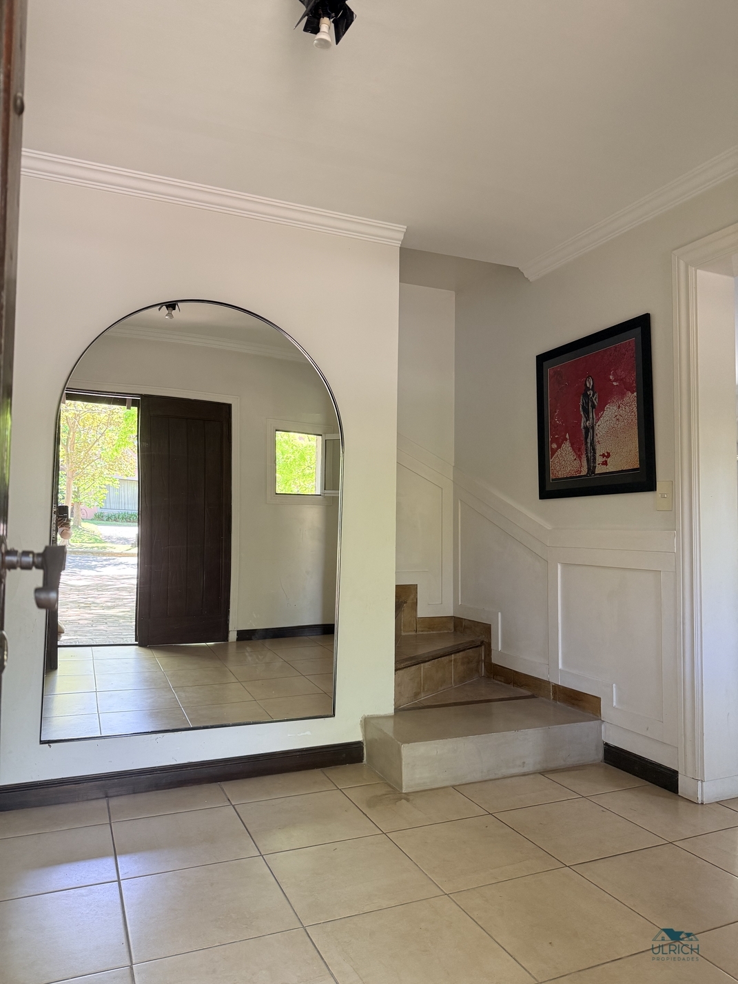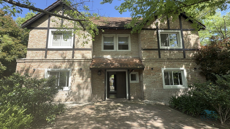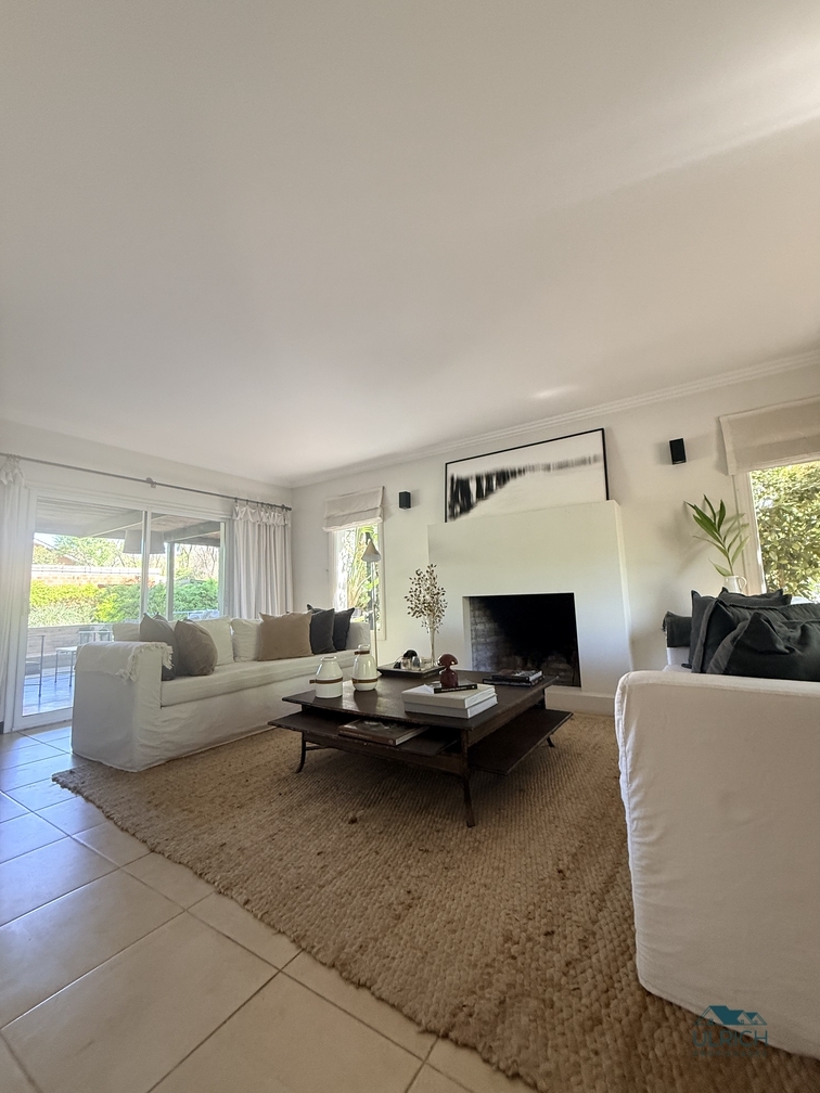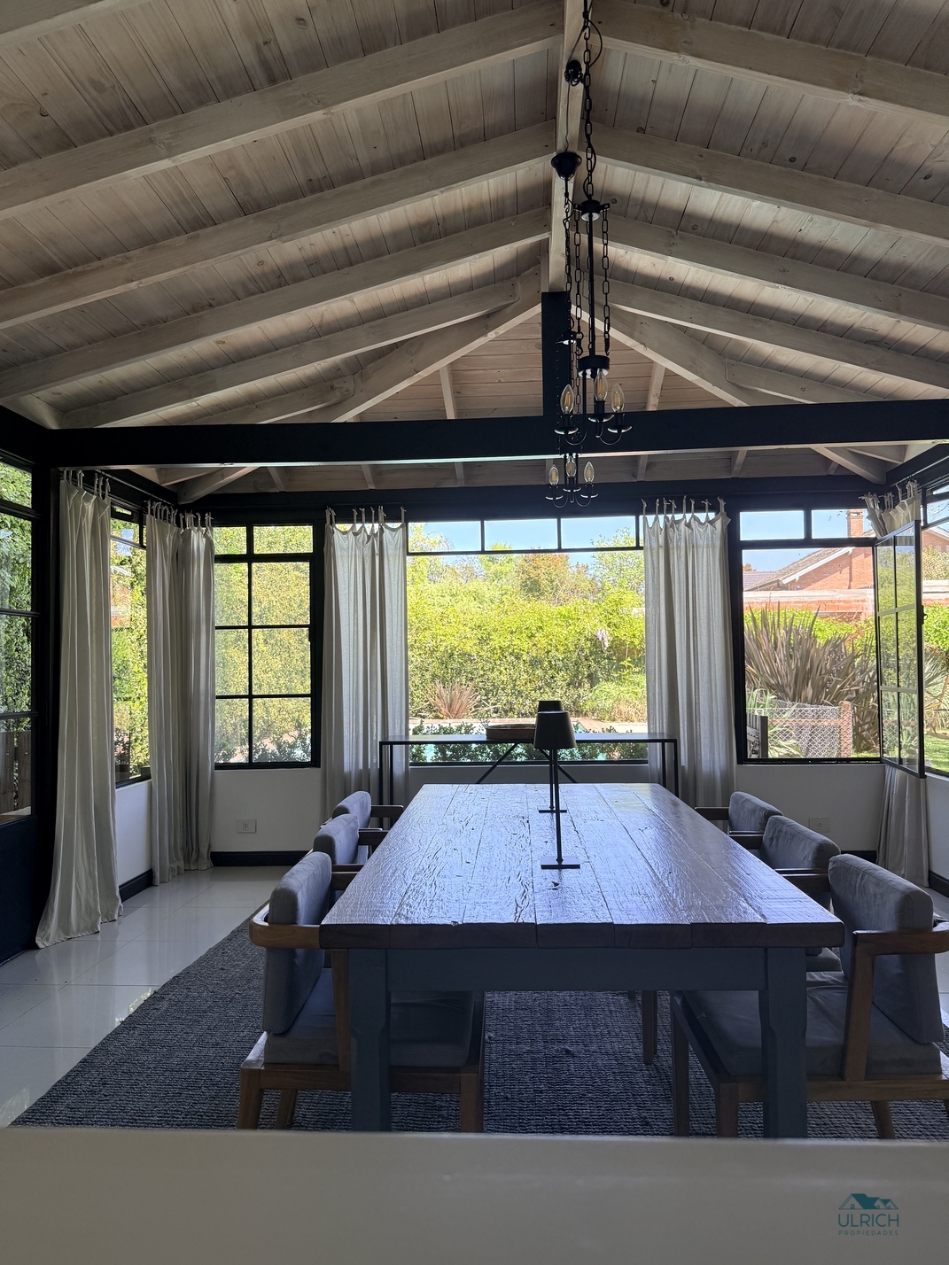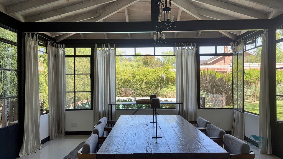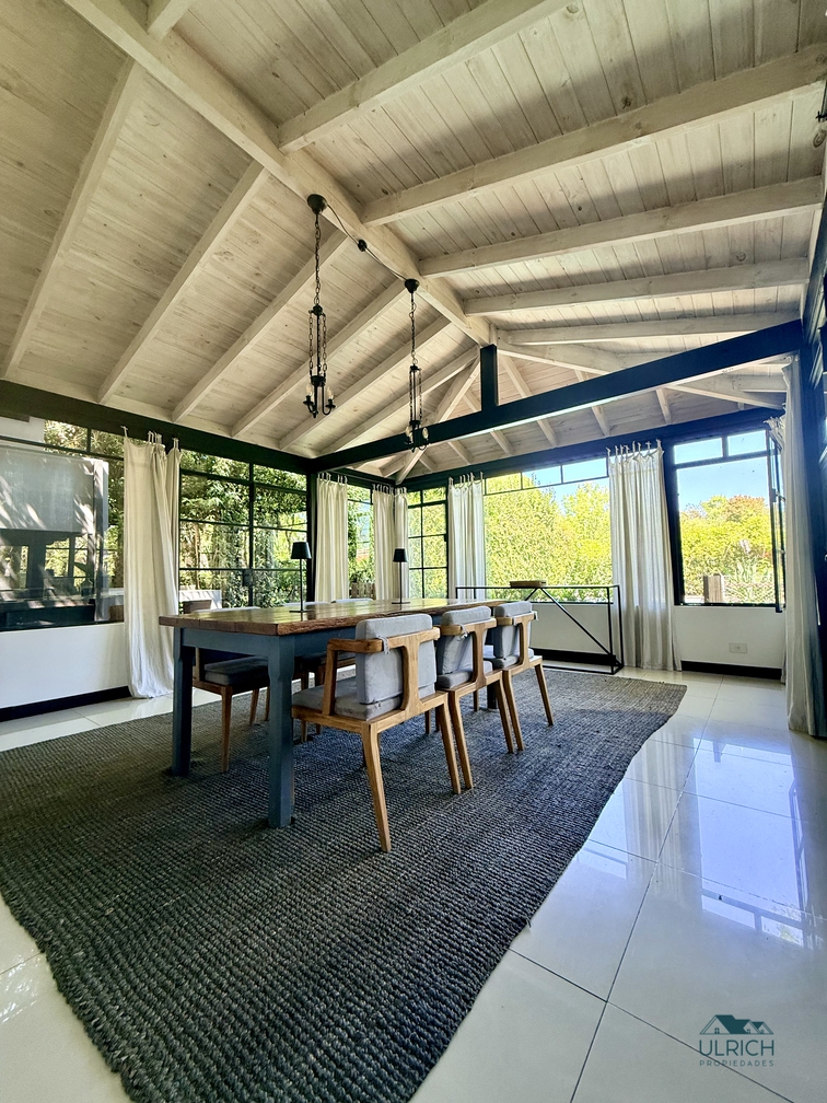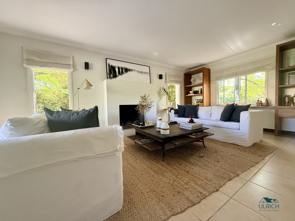 Al entrar, un hall de recepción conduce a un living muy amplio con chimenea, rodeado de ventanales que enmarcan el verde del jardín y se integran con un comedor generoso y luminoso.