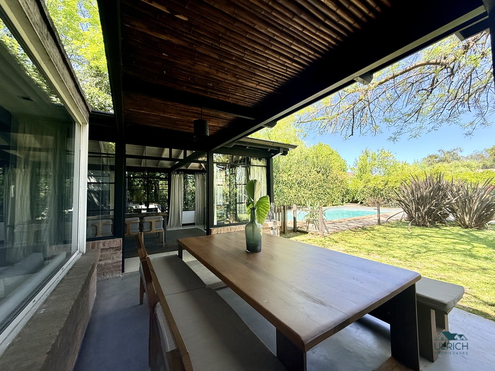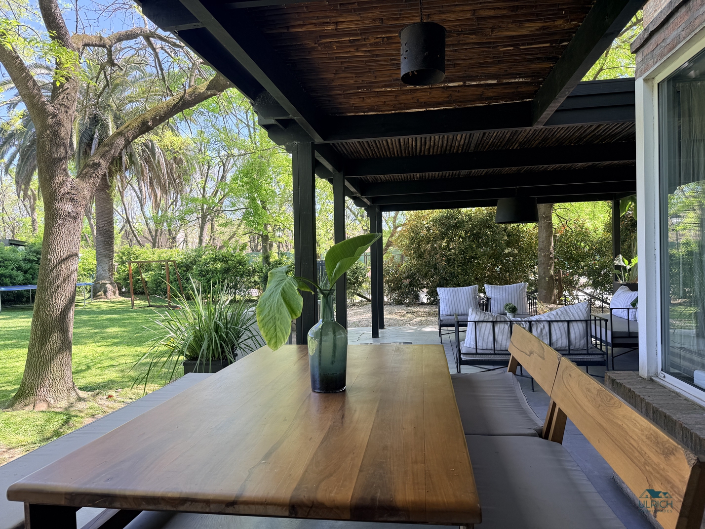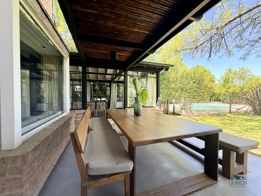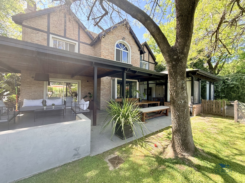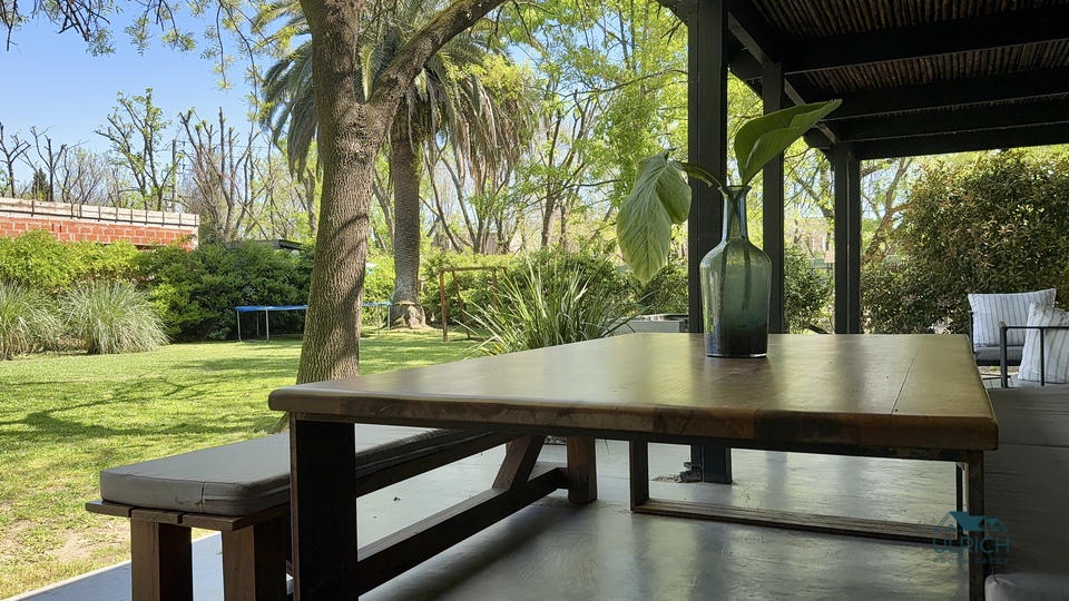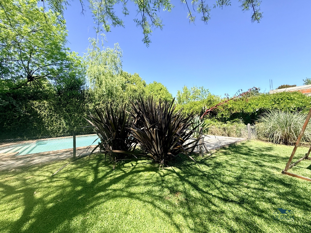Afuera, la casa se abre a un entorno soñado: una galería con fogonero, pileta y un jardín enorme que rodea toda la propiedad, ideal para disfrutar del sol y el aire libre todo el año.