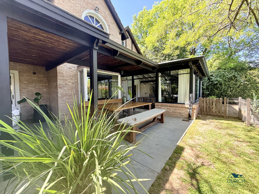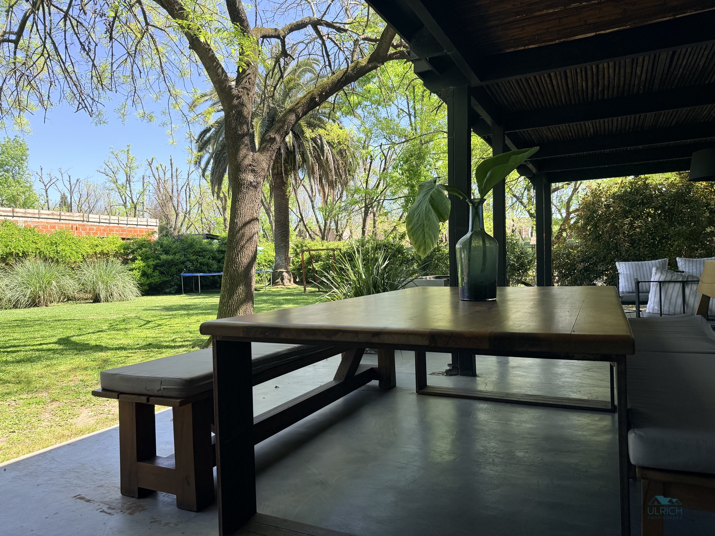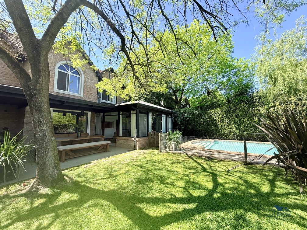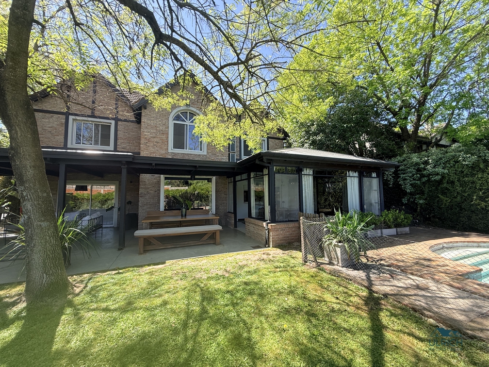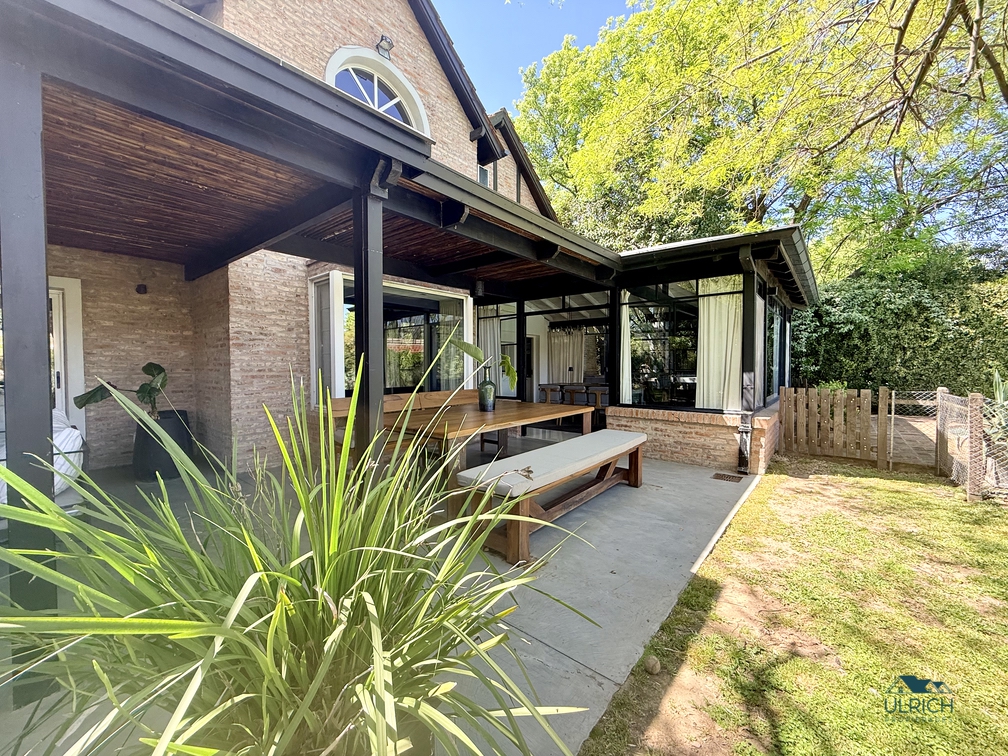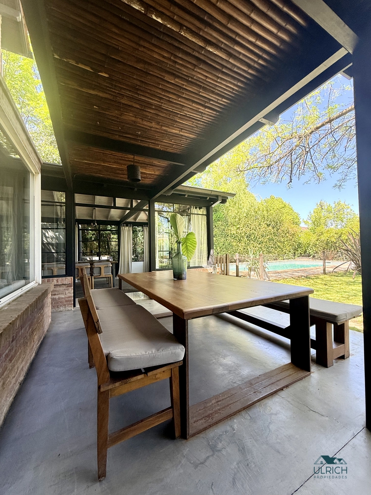 Afuera, la casa se abre a un entorno soñado: una galería con fogonero, pileta y un jardín enorme que rodea toda la propiedad, ideal para disfrutar del sol y el aire libre todo el año.