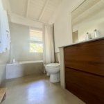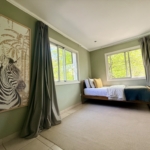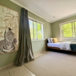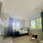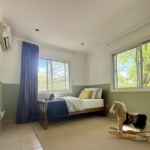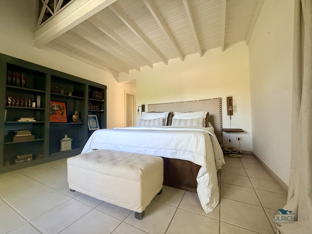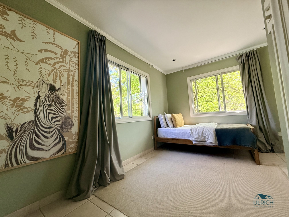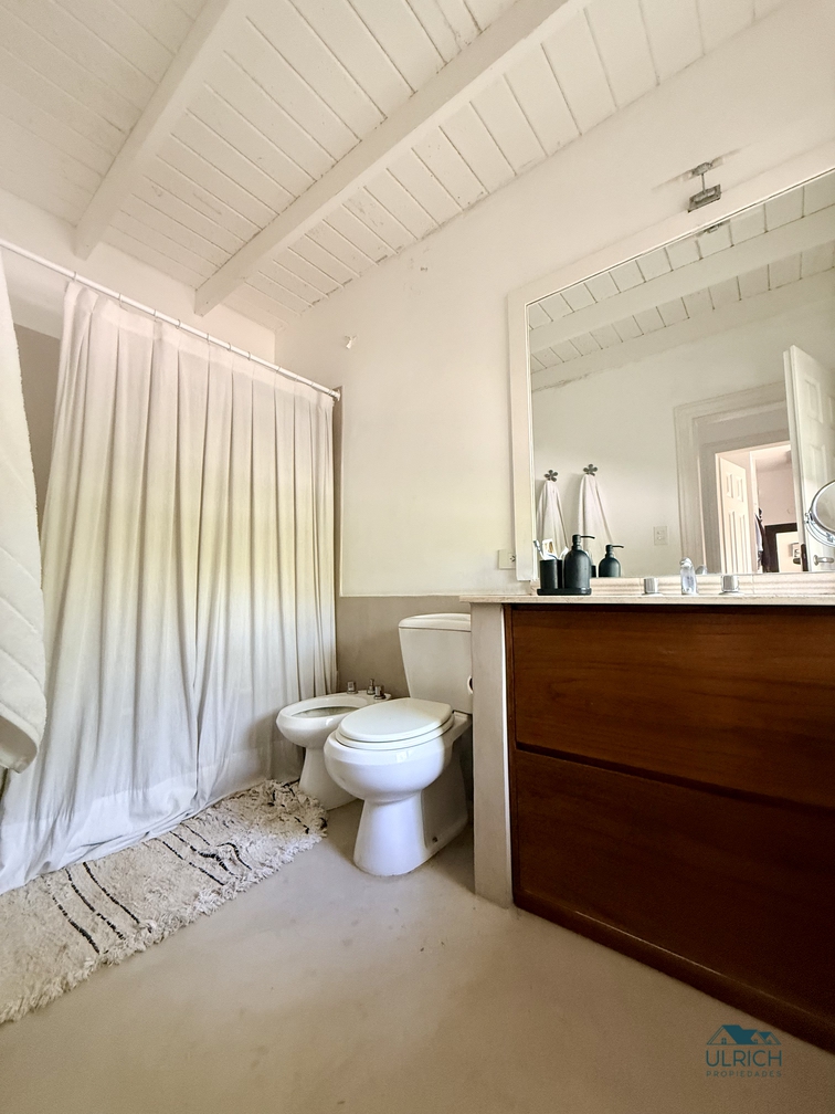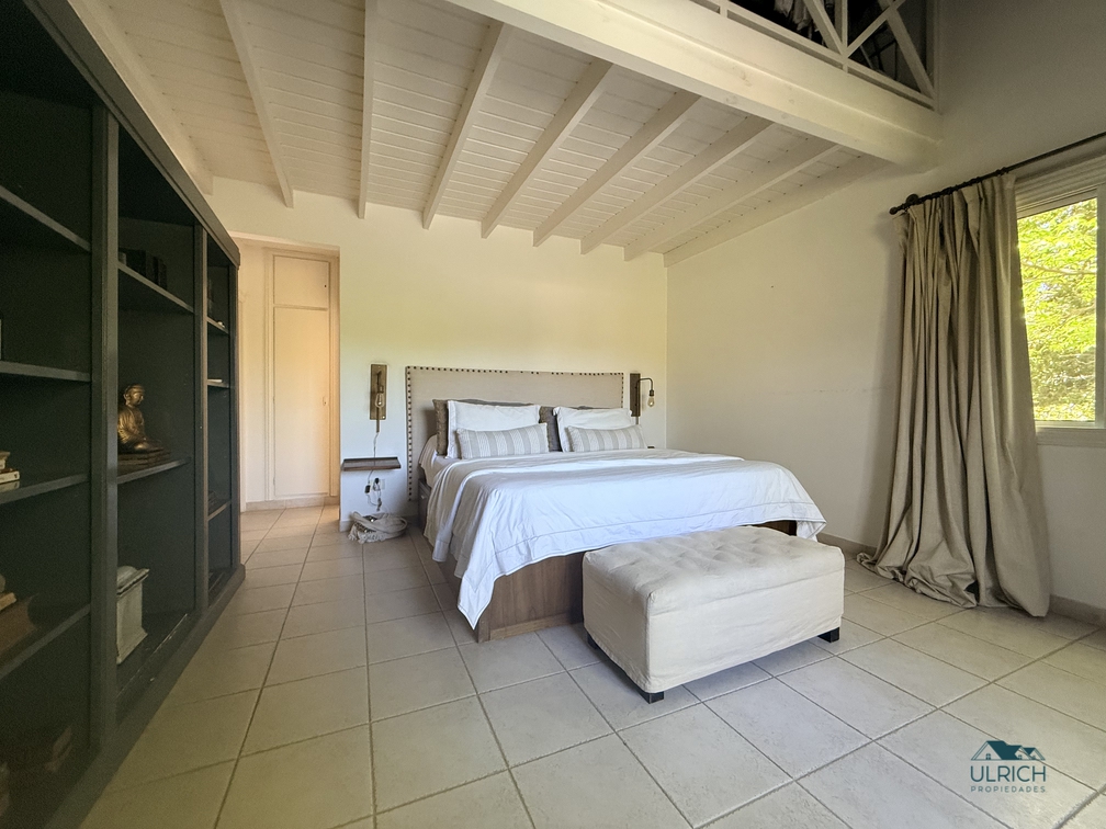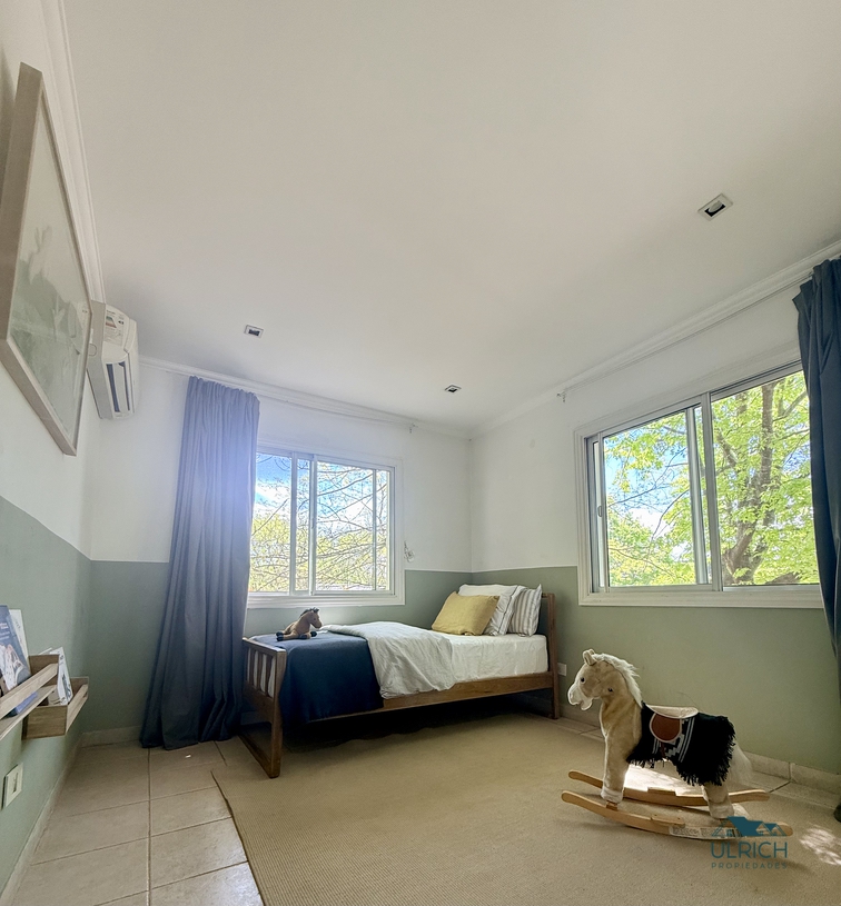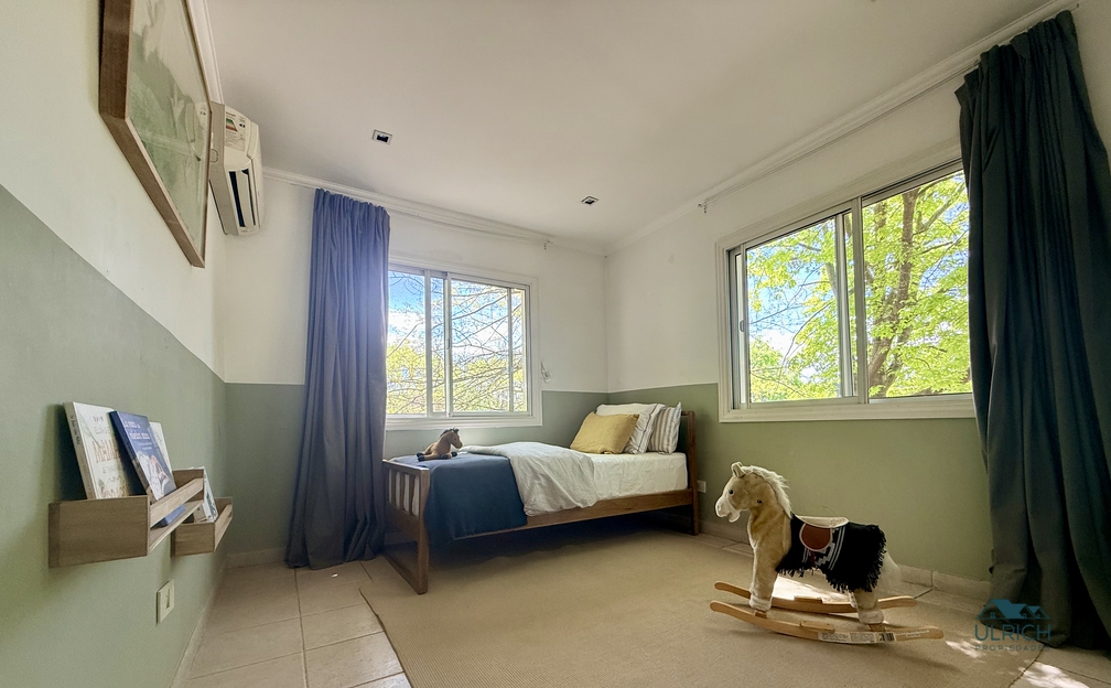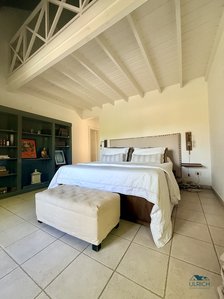 En la planta alta, un hall de distribución conecta el dormitorio principal en suite con dos cuartos amplios que comparten un baño.