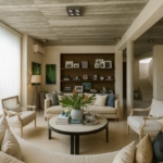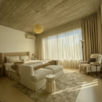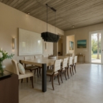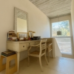 En planta alta, un hall de distribución conecta todos los dormitorios: un dormitorio en suite, dos dormitorios que comparten un baño completo, y una suite principal con vestidor y vistas abiertas al jardín.